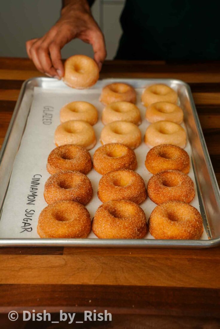 Allow the doughnuts to cool completely on a wire rack. Once cooled, feel free to glaze or dunk in anything you prefer. I’ve opted for cinnamon sugar and a classic vanilla glaze